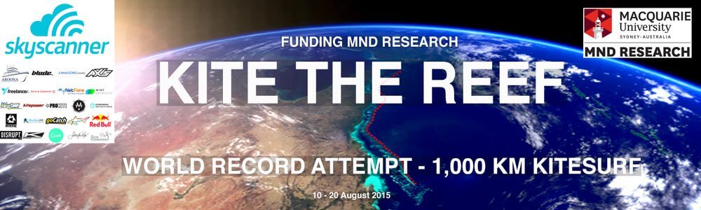Kite The Reef is a kitesurfing world record breaking expedition to raise funds to cure Motor Neurone Disease (MND) at the Macquarie University Motor Neurone Disease Research Centre. The particpants and sponsors are covering the costs of the expedition. Every single dollar raised goes to fund MND research (equipment, regents, researcher salaries) to make MND history.
